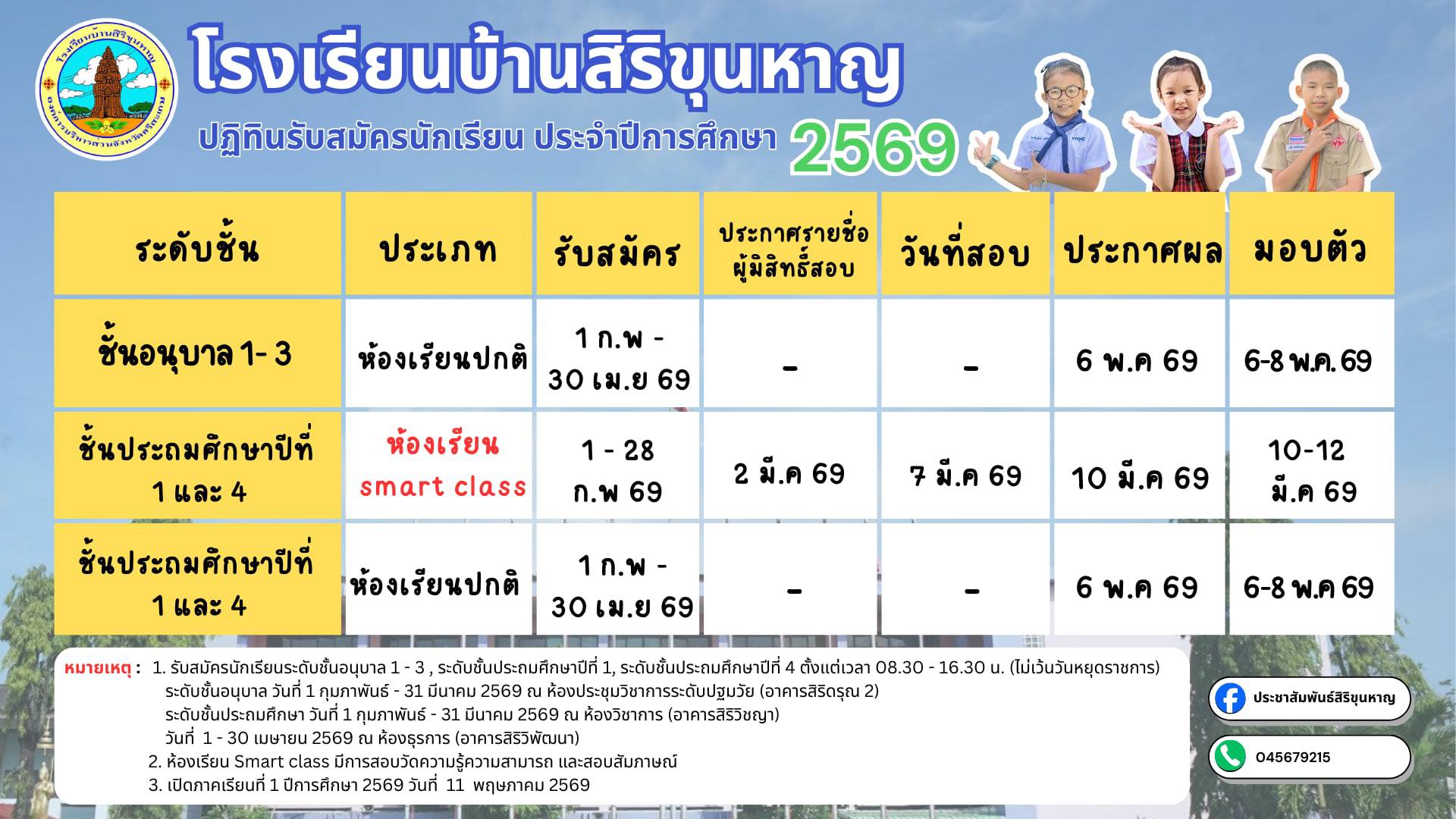 โรงเรียนบ้านสิริขุนหาญ ประกาศรับสมัครนักเรียนใหม่ ประจำปีการศึกษา 2569
