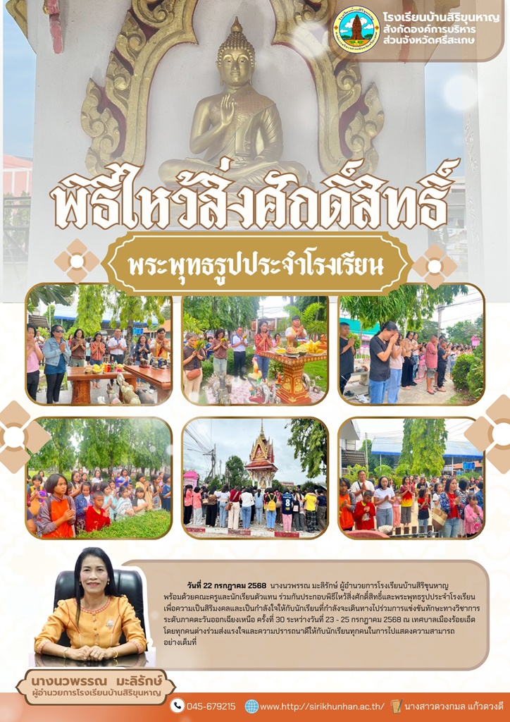 วันที่ 22 กรกฎาคม 2568 นางนวพรรณ มะลิรักษ์ ผู้อำนวยการโรงเรียนบ้านสิริขุนหาญ พร้อมด้วยคณะครูและนักเรียนตัวแทน ร่วมกันประกอบพิธีไหว้สิ่งศักดิ์สิทธิ์และพระพุทธรูปประจำโรงเรียน เพื่อความเป็นสิริมงคลและเป็นกำลังใจให้กับนักเรียนที่กำลังจะเดินทางไปร่วมการแข่งขันทักษะทางวิชาการ ระดับภาคตะวันออกเฉียงเหนือ ครั้งที่ 30 ระหว่างวันที่ 23 - 25 กรกฎาคม 2568 ณ เทศบาลเมืองร้อยเอ็ด โดยทุกคนต่างร่วมส่งแรงใจและความปรารถนาดีให้กับนักเรียนทุกคนในการไปแสดงความสามารถอย่างเต็มที่ ✌❤ |