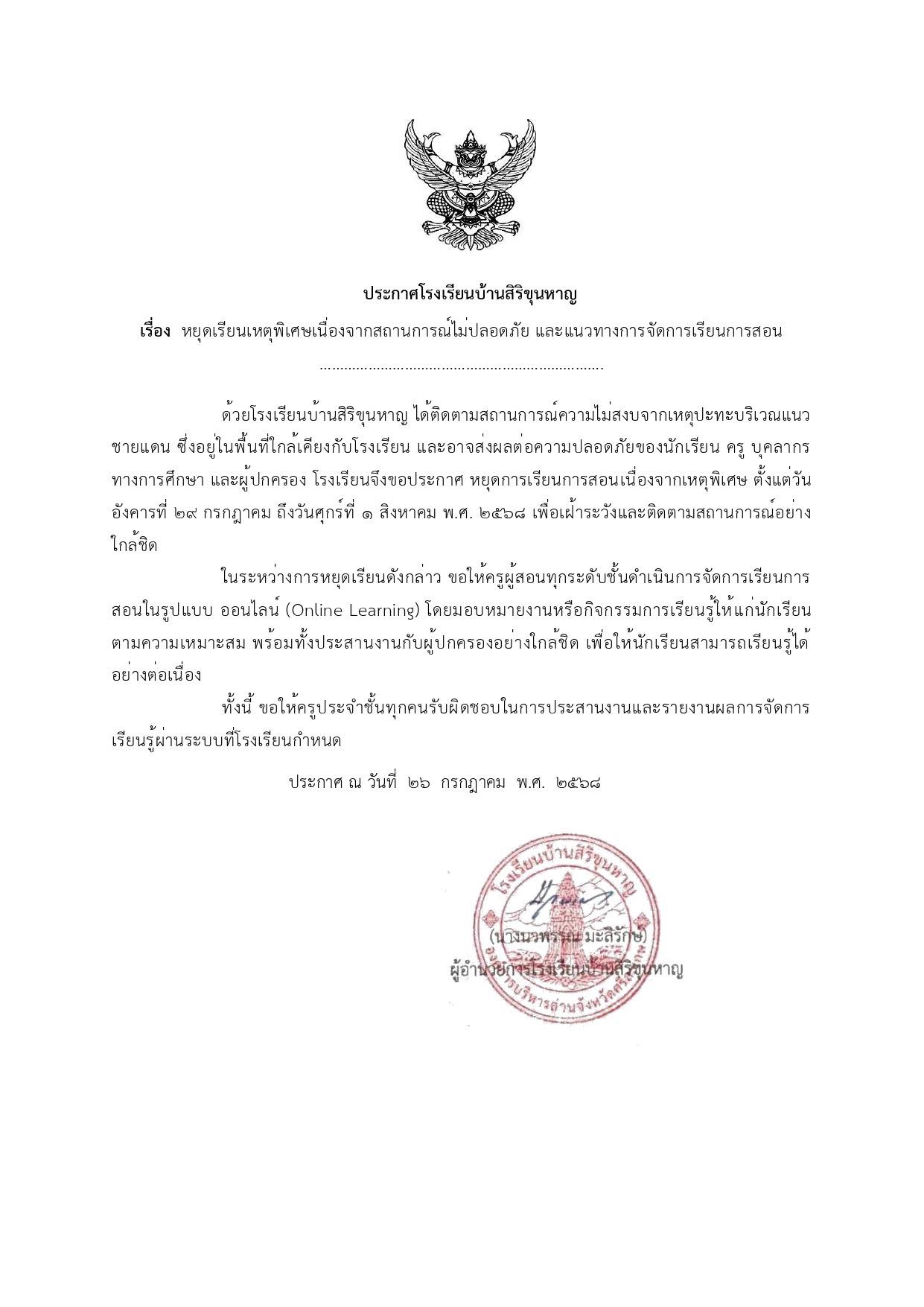 ?ด้วยโรงเรียนบ้านสิริขุนหาญ ได้ติดตามสถานการณ์ความไม่สงบจากเหตุปะทะบริเวณแนวชายแดน ซึ่งอยู่ในพื้นที่ใกล้เคียงกับโรงเรียน และอาจส่งผลต่อความปลอดภัยของนักเรียน ครู บุคลากรทางการศึกษา และผู้ปกครอง โรงเรียนจึงขอประกาศ หยุดการเรียนการสอนเนื่องจากเหตุพิเศษ ตั้งแต่วันอังคารที่ ๒๙ กรกฎาคม ถึงวันศุกร์ที่ ๑ สิงหาคม พ.ศ. ๒๕๖๘ เพื่อเฝ้าระวังและติดตามสถานการณ์อย่างใกล้ชิด
