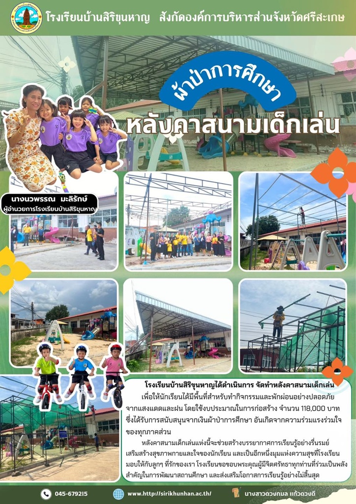 ?โรงเรียนบ้านสิริขุนหาญ ได้ดำเนินการ จัดทำหลังคาสนามเด็กเล่น เพื่อให้นักเรียนได้มีพื้นที่สำหรับทำกิจกรรมและพักผ่อนอย่างปลอดภัยจากแสงแดดและฝน โดยใช้งบประมาณในการก่อสร้างจำนวน 118,000 บาท ซึ่งได้รับการสนับสนุนจาก เงินผ้าป่าการศึกษา อันเกิดจากความร่วมแรงร่วมใจของทุกภาคส่วน